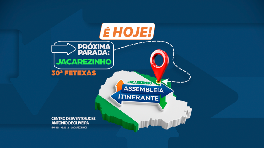 A Assembleia Legislativa do Paraná desembarca pela primeira vez em Jacarezinho, norte do Paraná, nesta quinta-feira (10). A sessão especial da 24ª edição da Assembleia Itinerante, projeto de interiorização do Poder Legislativo Estadual, será realizada às 18 horas, na 30ª Fetexas, no Centro de Eventos José Antônio de Oliveira.