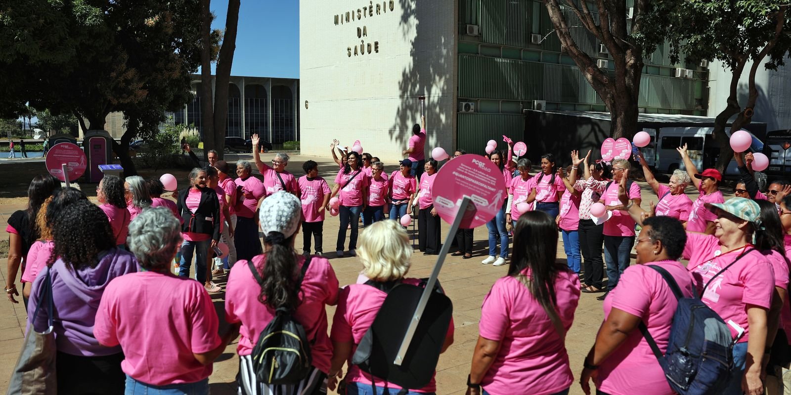 Pacientes oncológicas e representantes da Federação Brasileira de Instituições Filantrópicas de Apoio à Saúde da Mama (Femama) realizam nesta quarta-feira (9) manifestação, em frente ao Ministério da Saúde, em Brasília, em prol do acesso a tratamentos para a doença em estágio avançado e metastático via Sistema Único de Saúde (SUS) já aprovados, mas ainda não disponibilizados.